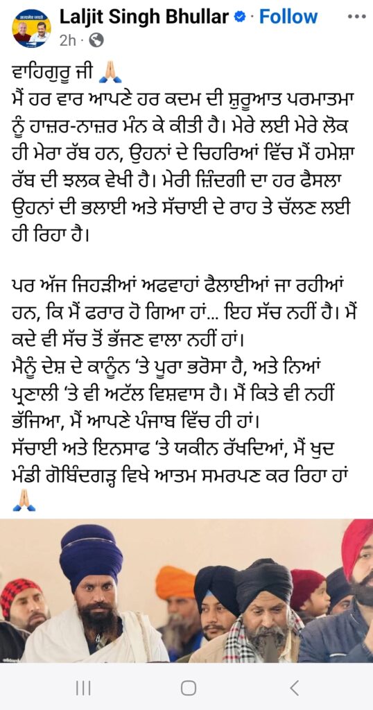 The alleged arrest of the former minister Laljit Singh Bhullar from Mandi Gobindgarh has been contradicted by Bhullar himself posting on Facebook that he has surrendered voluntarily today.